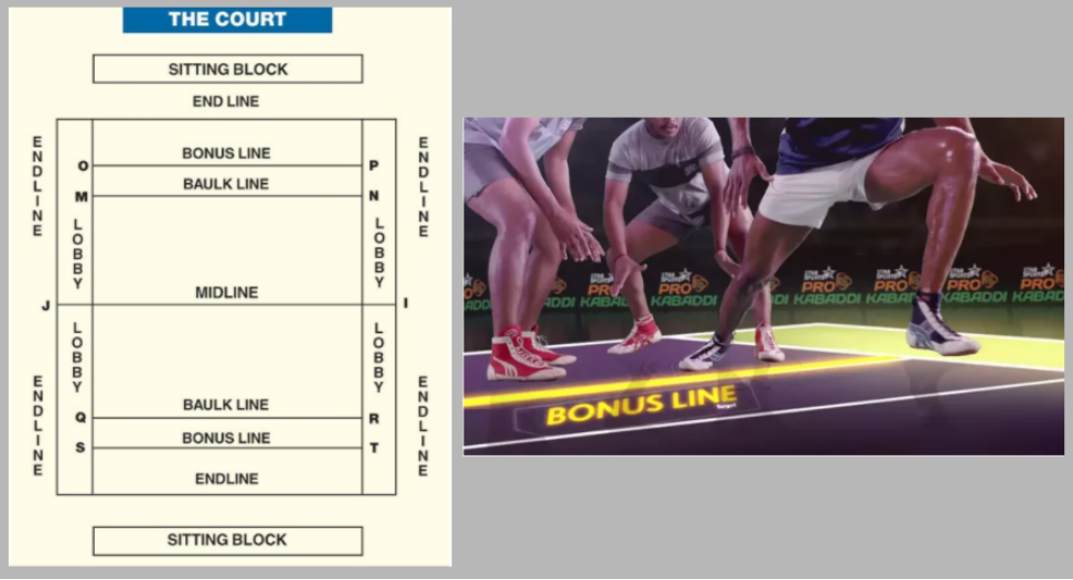 বোনাস লাইন – বোনাস লাইন তখনই সক্রিয় থাকে যখন আদালতে 6 বা 7 ডিফেন্ডার থাকে। যদি একজন রেইডার বোনাস লাইনে এক পা এবং বাতাসে এক পা রাখে, সে যতক্ষণ না এটি মিডলাইনে ফিরে আসে ততক্ষণ সে এক পয়েন্ট স্কোর করবে।